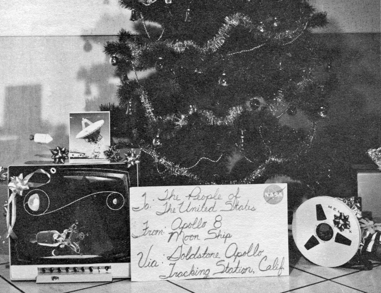 5. At Goldstone, a TV monitor, telemetry tape and Christmas card under the tree. Photo from Goddard News, 13 January 1969. |