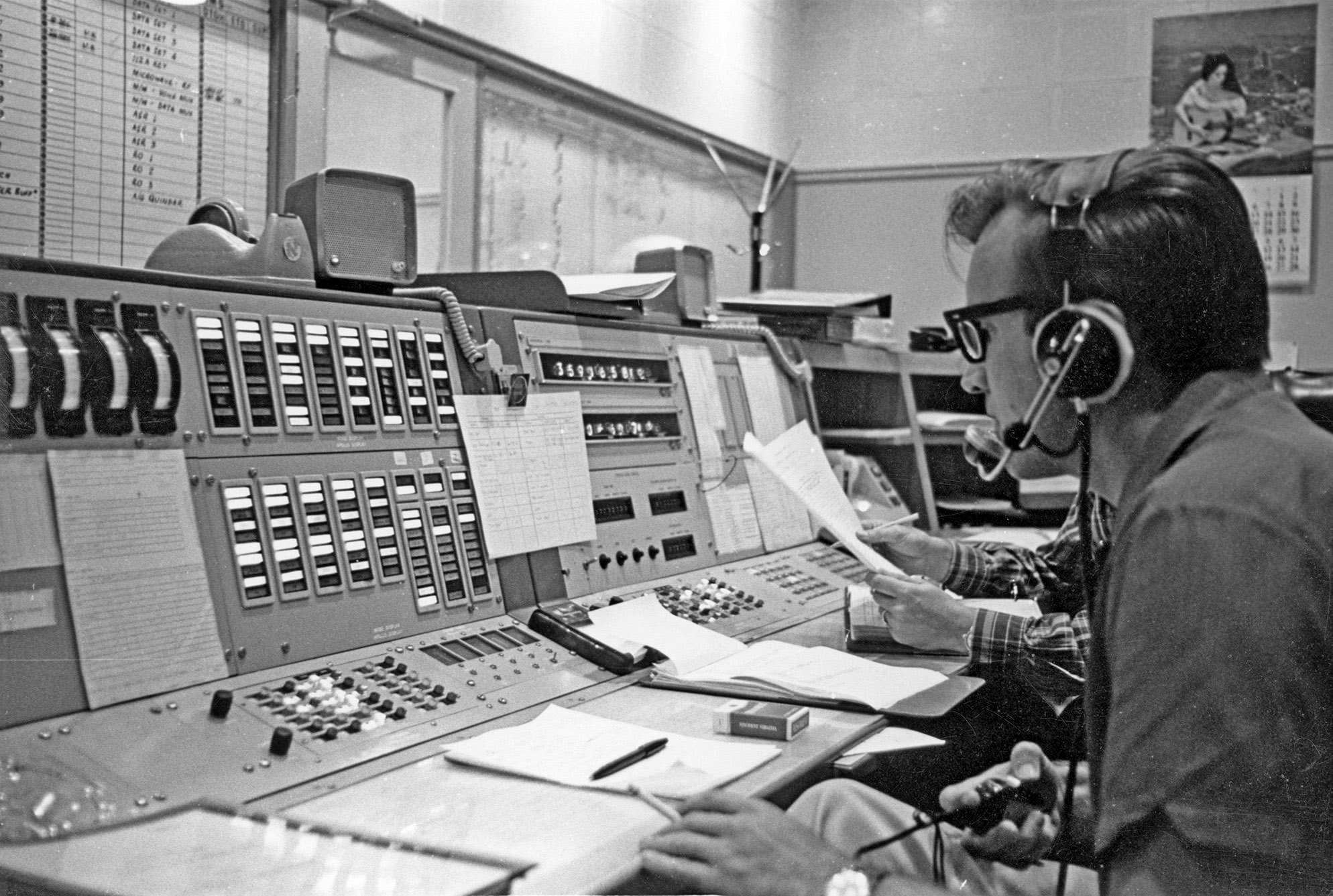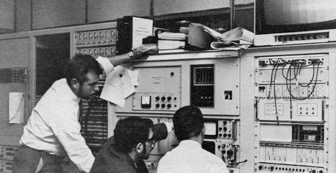 4. Honeysuckle’s Station Director Tom Reid and Ops Supervisor Ken Lee, at the Ops Console, post-pass, at 2:58am local time, Christmas morning 1968. |