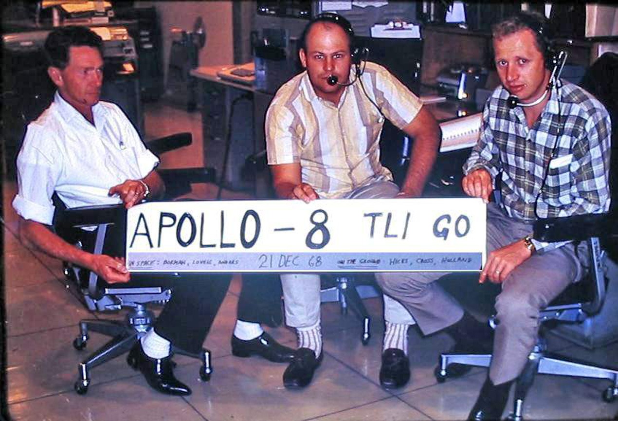 2. Honeysuckle Creek’s Dutchy Holland, Ron Hicks and Clive Cross celebrate that Apollo 8 is GO for Trans Lunar Injection. |