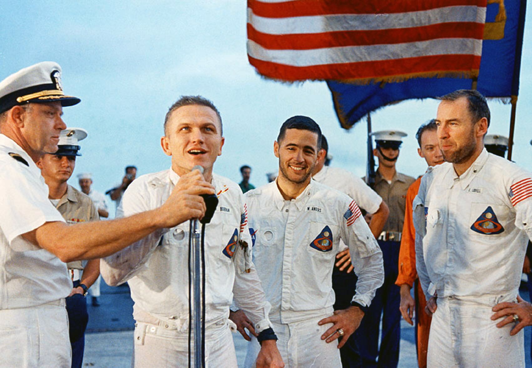 6. The triumphant Apollo 8 crew on the Yorktown after their fiery return. NASA image 68-HC-883. |